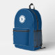 Blue backpack features a bold blue monogram in a white circle with a narrow blue border and a thin outer white ring. Add your initial in the sidebar.