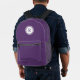 Cool purple backpack features a bold purple monogram in a white circle with a narrow violet border and a thin outer white ring. Add your initial in the sidebar.