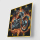 Bold motorcycle engulfed in vibrant flames at dusk square wall clock