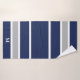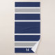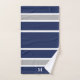 Make a statement with this bold navy blue, white, and grey striped bath towel set. Both the hand towel and the bath towel have your monogram in white at the bottom. Especially appropriate for a man, but attractive in any bathroom.