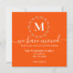 This we have moved announcement card is classy and elegant. It features a bold orange background with a white botanical wreath monogram and white typography.