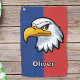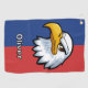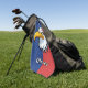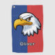 This personalised golf towel features a determined cartoon eagle head design against a vibrant blue and red background.