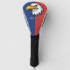 This personalised golf head cover features a determined cartoon eagle head design against a vibrant blue and red background.
