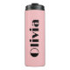 Simple pink and black thermal tumbler featuring your name in a fun retro text. Fully editable, including tumbler base colour, and text wording, colour, size, and style. Select "Personalise this template", and make your desired changes, or you can order this tumbler as is. Shown is the name, Olivia, in black retro text on an pink tumbler with black lid. A personalised tumbler makes a wonderful gift for your bridesmaids, maid of honour, weekend guests, family reunion, or for a girls' night out! From 369MyName.