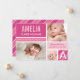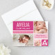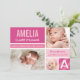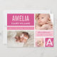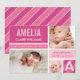 Announce your baby girl's arrival with this bold, modern colour block birth announcement card. Three photos of your newborn are displayed in a vibrant collage layout featuring hot pink, light pink, and white blocks with a diagonal stripe accent and oversized monogram initial. The baby's name, birth date, time, weight, and length are prominently featured alongside a message from the proud parents. All text, colours, and photos are fully customisable.