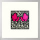 Make a statement with this bold and vibrant pop art print featuring two striking pink tulips set against a graphic black and white background. The minimalist design and bold colours create a modern and eye-catching piece.
