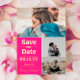Photo collage save the date in a retro typography design and bold pink accent colour and gold foil. Photo save the date personalised with three photos, your wedding date in bold gold foil numbers, and your names in a modern script.