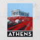 Celebrate the history of Athens, Greece, with this striking and dramatic postcard. The design features a bold, graphic illustration of the magnificent Parthenon standing atop the Acropolis. The abstract, vibrant red foreground contrasts sharply with the white temple and the patterned blue sky, creating a modern pop art feel. The bottom border features the classic Greek key pattern and the clear, block lettering declares "ATHENS". This card is perfect for art lovers, history buffs, or anyone who appreciates a unique, modern interpretation of a classical landmark.
