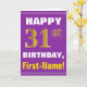 This simple birthday-themed greeting card design features a warm birthday wish like "HAPPY 31st BIRTHDAY, First-Name!" on the front, in bold text on a purple colored background. The birthday number has a faux/imitation gold-like coloring look. The name on the front can be customized. The inside features a birthday message that can be customized. A greeting card like this could be a fun way to deliver birthday wishes to somebody who is celebrating their thirty first birthday. [~Z0000277]