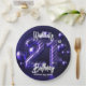 Celebrate your 21st birthday with this stunning, customisable paper plate. This midnight purple design features a bold '21' in high-gloss metallic purple, adorned with an eye-catching striped texture that sparkles as if illuminated by glittering starlight. Sleek, reflective purple balloons float in the background, adding a luxurious, three-dimensional effect to the plate. You can easily personalise it with your name and date to perfectly match your milestone celebration. This plate will transform a simple buffet into a spectacular display.