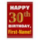 This simple birthday-themed greeting card design features a warm birthday wish like "HAPPY 30th BIRTHDAY, First-Name!" on the front, in bold text on a red coloured background. The birthday number has a faux/imitation gold-like colouring look. The name on the front can be personalised. The inside features a birthday message that can be customised. A greeting card like this could be a fun way to deliver birthday wishes to somebody who is celebrating their thirtieth birthday. [~Z0000276]