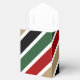 This bright and colourful Holiday favour box will grab attention at any Christmas party or gathering! Bold stripes in colours of green, red, white, antique gold and black make it a stand out. The solid red front flap holds your custom text in white. All the text may be easily customised. Thanks to MilachiDesigns on etsy.com for the pattern used in this design.