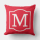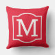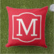 A bold outdoor pillow featuring a white monogram initial inside a decorative bracket frame on a vibrant red background. The oversized serif letter and elegant notched border create a striking, confident accent for patio furniture, deck seating, or porch decor. The initial is fully customisable.