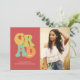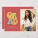 This fun graduation invitation has a modern take on vintage 1970s design. The front of the card includes 70s lettering on the left and a vertical photo on the right. The retro typography reads "Grad" in shades of sunny yellow, turquoise blue, summer green, and bright orange against a watermelon pink background. The graduate's name and school are written below the typography, and the graduation year is written across the D in "Grad". On the back, there is a template for graduation party details.