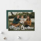Stylish holiday card featuring your horizontal photo on the front with "Merry Christmas" displayed in a bold retro script overlay. Personalise the front of the photo Christmas card with your family name and the year. The card reverses to display an additional photo framed in white with a dark green background with subtle white dots.