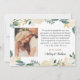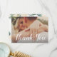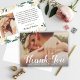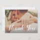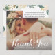 Large, sweeping calligraphy script spells out "thank you" with a charming heart accent across a full-bleed wedding photo on this elegant flat thank you card. Names and wedding date are displayed in clean type beneath. The back features a second photo alongside a warm, pre-written message framed by a delicate white floral and greenery border. All text is fully customizable.