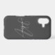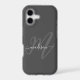 A bold stylish iPhone 17 case design featuring your monogram initial in large stylish font in gray with your name in a white handwritten font over a darker charcoal gray background. The look is stylish and attractive and all about you! It's a great choice for protecting your smart phone in a stylish manner - it's fashion for your phone! Personalize with your name and initial. When personalizing your name, be sure to leave the square box symbols on either end of your name. They create the leading and trailing swashes that add a stylish look. If you need to re-center your initial after personalizing it, select "edit using design template" which will open the full editor and allow you to move things around as needed. Other models of phone cases are also available in this stylish design.