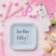 This personalised paper plate features a soft icy blue background with a bold “hello fifty” message and custom celebration details. Designed for milestone birthday parties, it works well for cocktail tables, bar setups, and casual seating areas. The cool dusty blue colour coordinates easily with modern party décor. A functional detail that helps keep drink areas consistent throughout the celebration.