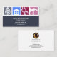 Card features a two columned design. The top white column is accentuated by four colourful service logos. It list some of the services offered by the contractor. The leaf is for landscaping, the home for construction works, the plug point for M&E works and finally the hammer for carpentry. Your card details are listed at the dark blue column below. Your name and job title are at the top. This is followed by the business name and contact details.
