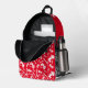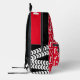 Bold stylised tractor graphic and wheat personalised add your own name repeat patterned racksack backpack bag in bright red, white and black. Ideal for boys or those who like farming and tractors. Customise with your own choice of short name all over currently reads Ruben and your school or family name or just your name at the top of the bag. The background colour can also be changed if required, currently bright red. Original art and design by Sarah Trett for www.mylittleeden.com