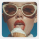 A striking, retro-inspired close-up of a glamourous woman in oversized sunglasses enjoying a creamy ice cream cone under the sun. The image features bold red lipstick, flawless skin, and a stylish waffle-knit sweater, embodying vintage fashion with a modern twist.