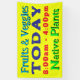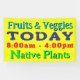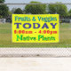 Large fabric sign to hang in bright yellow.  "Today" text is prominent with three other lines to customise.  Example wording is "Fruits and Veggies" and "native plants" with time in bright red.  The 3x5 foot sign design can be transferred to other sizes.  Be sure your text fits inside the sign away from the edges.