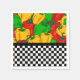 Top half of this paper party  napkin design is bright and bold coloured bell peppers in green, red and yellow with bottom half a black and white chequerboard.