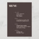 This wedding menu card features a rich brown background with ivory typography and a clean, easy-to-read layout for reception tables. Customize the wording to list appetizers, dinner options, and dessert so guests know what to expect throughout the meal. The vertical format works well for plated dinners, buffets, or family-style receptions. A polished paper detail that complements modern and minimalist wedding decor.