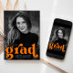 Stylish graduation announcements featuring the graduate's vertical photo with "grad" in bold orange lettering. Personalise the photo graduation announcement by adding the graduate's name, graduation year, and school. The announcement reverses to display an orange and white retro arch pattern.