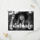 Bold graduation party invitation postcards featuring the graduate's horizontal photo with "graduate" in bold white lettering. Personalise the photo graduation party invites by adding the graduate's name, graduation year, and school. The postcard graduation party invite reverses to display your return address and party details.