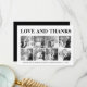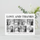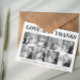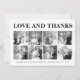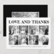 Bold typography Thank You eight photo collage card with the text "Love and Thanks". The backside includes another photo of the newlyweds on black.