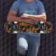 This skateboard features a gritty urban-inspired graffiti pattern with dark tones of blue, black, and orange, highlighted by the bold "Ride Fast Live Free" motto in fiery orange. The raw, abstract style perfectly captures the rebellious spirit of skate culture, making it ideal for skaters who thrive on speed and freedom. With its layered textures and energetic vibe, this skateboard is a striking choice for anyone looking to make a statement at the skatepark or on the streets.