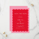 A modern and colourful wedding save the date announcement with a retro vibe featuring a wavy scallop shape in red with a contrasting pink edge with white font. Add your wedding and QR code on the reverse.