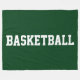 This sporty design features bold white BASKETBALL text centered on deep forest background.