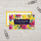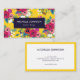 Striking floral business card featuring a pattern of hand-drawn flowers in pink and purple against a bright yellow background. The back is white with dark blue text and a matching yellow border. An eye catching floral business card for you who want to stand out.