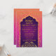 Arabian Nights Bollywood inspired sweet sixteen birthday invitation card in magenta orange purple ombre with glitter and foil-look scrolls motifs and borders.