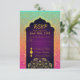 Bollywood or Arabian Nights theme wedding RSVP card in hot pink, orange, and aqua ombre with gold foil accents.