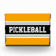 This sporty design features athletic PICKLEBALL text inside a highlighted wide black stripe with adjoining double white racing stripes against a bright golden yellow outer stripes. The colours and text in this design can be personalised.
