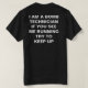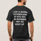 Bomb technician shirt, bold white letters on dark background. Words on back only so you don't have to turn around to explain the joke to people.