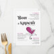 These vintage style 5" x 7" wedding dinner paper sheet menus black lettering with a stylised heading, "Bon Appetit," in large black letters with a magenta heart accent on an alabaster background. The menu has placeholders for 2 appetizers, 2 entrees, and 2 desserts and the wedding couple names.