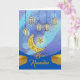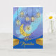 Bon Ramadan, greetings in French. Lanterns at night above a crescent moon and glowing star. Watercolors mixed with black pen and splashes of gold metallic tones. Custom the verse inside as you like. Art, image, and verse copyright Shoaff Ballanger Studios, 2022.