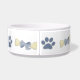 Pet bowl for dog with bones, blue bows and blue paw prints.