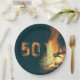 Bonfire birthday party paper plates. Dark teal blue colour with a burning fire image and a place for age.