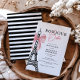 This elegant Paris-inspired baby shower invitation features a chic black and white design with a hand-drawn Eiffel Tower with a soft pink watercolor bow. The sophisticated typography blends classic serif and stylish handwritten script fonts, with "Bonjour Bébé" in a delicate mix of black and blush pink, adding a touch of French charm. The back of the invitation showcases a bold black and white horizontal stripe pattern, creating a fashionable contrast. Perfect for a Paris-themed baby shower, this design exudes timeless elegance, romance, and modern sophistication, making it an ideal choice for celebrating a little one’s arrival in style.