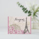 A whimsical vintage collage which has an old french postcard background with an eiffel tower sketch and some pink and white wildflowers bordering the bottom. Customizable text says bonjour in a fancy hand written font.