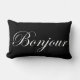 This pillow features a black background with the French word Bonjour in white. In English Bonjour translates to mean Hello, Good Morning or Good Day.