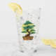 traditional watercolor design of a japanese bonsai tree in front of bright yellow sun on a drinking glass.