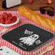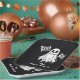 A cheerful ghost floats at the centre of this Halloween design, On either side, bold “BOO!” lettering adds festive flair in a fun, spooky style. The black background and white graphics create a crisp, high-contrast look that blends simplicity with seasonal charm.