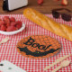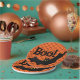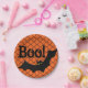 Boo! in grunge style text with black bat silhouette on orange background with chain link overlay