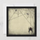 Black widow spider hangs down over "Boo" sign and old newspaper with spider webs.